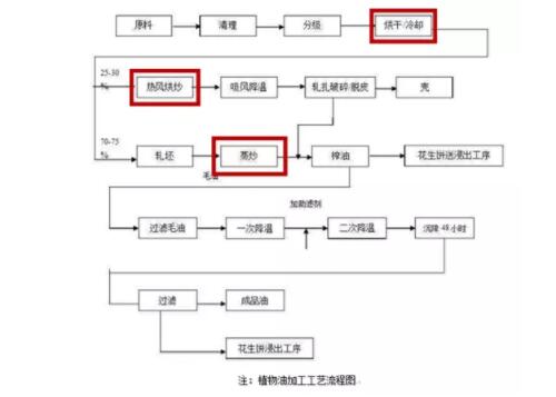 植物油加工的具體工藝流程一般是原料運輸、篩選、去殼、破碎、軟化、壓胚、蒸炒、壓榨或有機溶劑浸提。加工食用油時,多個工藝需要熱源,但出于安全考慮,所以使用蒸汽作為熱媒。其中對于較潮濕的物料進行烘干、對干燥的物料進行軟化加溫、浸出時加溫、分離粕殘溶和分離油脂的溶劑、精煉加溫等工序都需要直接蒸汽和間接熱源。
